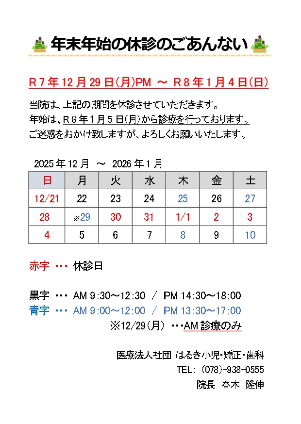 なお、年末年始の診療日および休診日に関しましては、下記ご確認のほどよろしくお願いいたします。